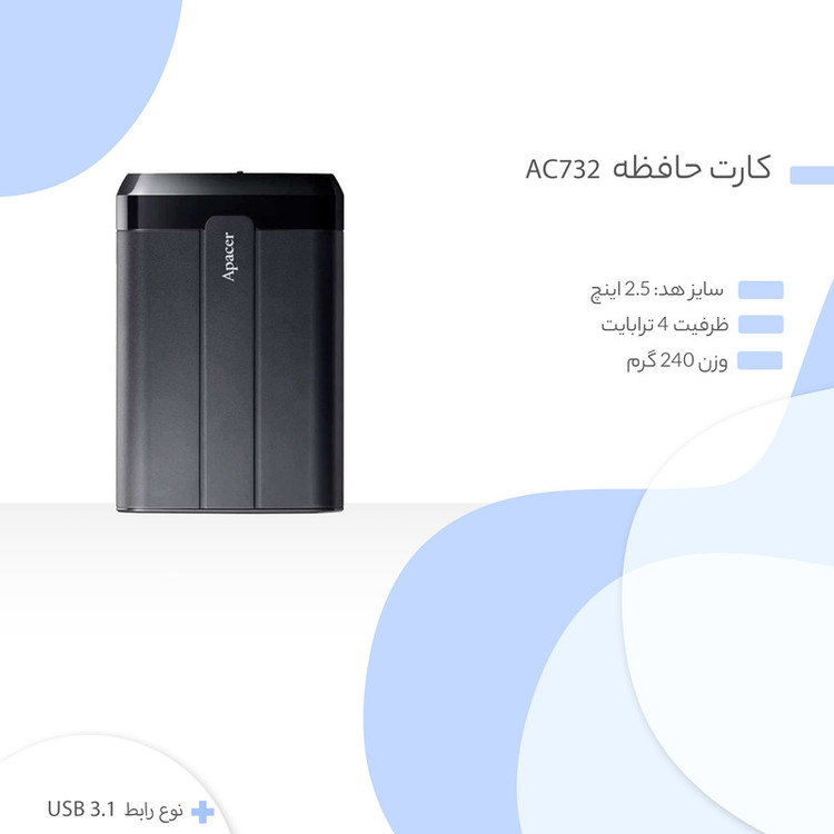 شرکت «اپیسر» محصولی را با نام «AC732» روانه بازار کرده است. این محصول یک هارد اکسترنال حرفهای برای ذخیرهسازی اطلاعات با سرعت زیاد است. هارد اکسترنال AC732 از طریق درگاه USB 3.1 به کامپیوتر متصل میشود. درگاه USB 3.1 ارائهشده روی این محصول از نوع A است و از آن میتوان روی کامپیوترهایی با درگاه USB 2.0 و USB 3.0 هم بهره برد. طراحی این محصول بهگونهای است که میتوان کابل اتصال را روی بدنهی هارد نصب کرد تا نگرانیای بابت گمشدن آن وجود نداشته باشد و از طرفی فضای بسیار کمی را اشغال کند. هارد اکسترنال AC732 در برابر آب مقاوم است؛ همچنین درصورتیکه این هارد از فاصلهی 1.5 متری رها شود، آسیبی به اطلاعات موجود در آن وارد نمیشود. مقاومت بسیار خوب این محصول تا 4000 کیلوگرم باعث شده که بتوانیم آن را جزو حرفهایترین هارددیسکهای شرکت اپیسر نام ببریم. شرکت اپیسر از برندهای بزرگ تولیدکنندهی تجهیزات کامپیوتری است که همواره محصولاتی باکیفیت را روانهی بازار میکند.