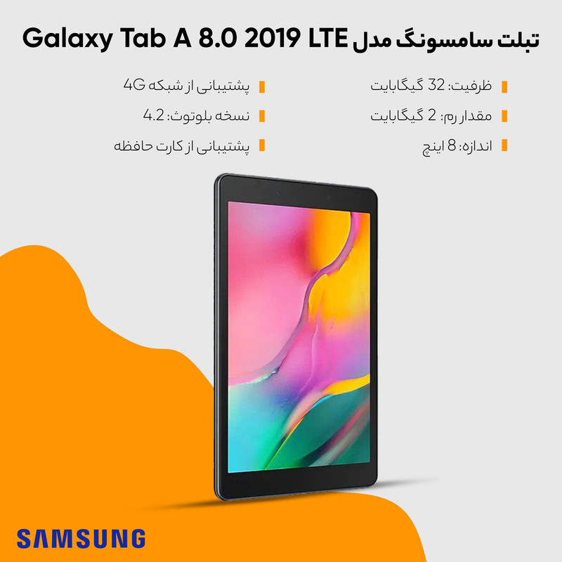 تبلت Samsung Galaxy Tab A 8.0 یکی از تبلت های میان رده سامسونگ به حساب می رود که در سال 2019 میلادی رونمایی و روانه بازار شد. مشخصات سخت افزاری و نرم افزاری متوسط و حضور برخی قابلیت های کاربردی، Tab A 8.0 را به گزینه ای مناسب در میان تبلت های میان رده تبدیل کرده است. صفحه نمایش Tab A 8.0، صفحه نمایشی 8.0 اینچ و از نوع TFT می باشد. رزولوشن این صفحه نمایش برابر با 1280 × 800 پیکسل و تراکم پیکسلی آن نیز برابر با 189 پیکسل بر اینچ می باشد. چیپست به کار گرفته شده در Tab A 8.0، چیپست میان رده Snapdragon 429 می باشد که از یک پردازنده هشت هسته با کلاک 2.0 گیگاهرتز و همچنین پرردازنده گرافیکی Adreno 504 تشکیل شده است. در نظر گرفته شدن حافظه رم 2 گیگابایتی در کنار این چیپست میان رده، قدرت پردازشی متوسطی را برای Tab A 8.0 به ارمغان می آورد به طوری که این تبلت قادر به اجرا بازی ها و برنامه های نسبتا سنگین نیز می باشد. حافظه داخلی Tab A 8.0 برابر با 32 گیگابایت می باشد که البته افزایش آن تا 1000 گیگابایت دیگر نیز به کمک کارت های حافظه جانبی، امکان پذیر می باشد. سامسونگ تبلت جدید خود را به یک دوربین 8 مگاپیکسل در قسمت پشت تبلت و به عنوان دوربین اصلی مجهز کرده است در حالی که در قسمت جلو تبلت نیز یک دوربین 2 مگاپیکسل به عنوان دوربین سلفی تبلت به کار گرفته شده است. از دیگر ویژگی های تبلت میان رده و جدید سامسونگ می توان به سیستم عامل Android 9.0 PIE، درگاه MICRO USB و باتری قدرتمند 5100 میلی آمپر ساعت، اشاره کرد. خرید تبلت Samsung Galaxy Tab A 8.0 به کاربرانی که قصد انجام کارهای روزمره خود یا اجرا برخی برنامه های نه چندان سنگین را در صفحه نمایش معمولی و با کیفیت Tab A 8.0 داشته و به تماشای فیلم و ویدیو در تبلت نیز علاقه مند می باشند، پیشنهاد می شود.